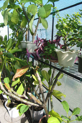 8月も下旬というのに、名古屋では連日35度以上の猛暑日が続いています。それでも遮光ネットのおかげで、プルメリアなどの植物たちは元気です。 |
