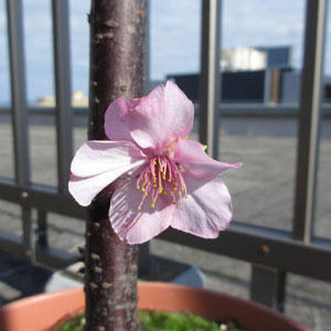河津桜が開花しました。日差しもたっぷりなのでルーフバルコニーへ。 |