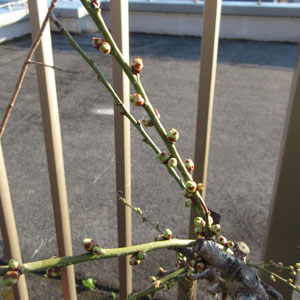 1週間前に購入した「しだれ梅」。たくさんのつぼみが色づき始めました。 |