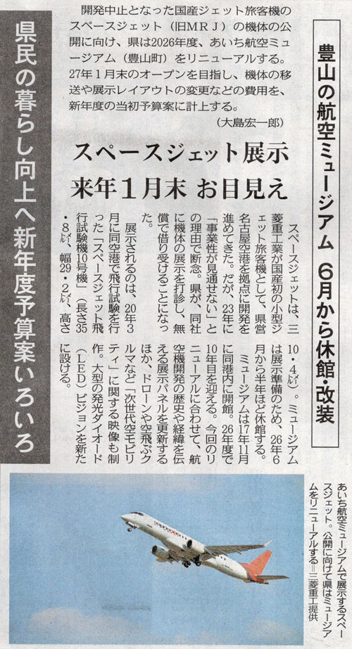 中日新聞1月5日朝刊、愛知県は2026年度、あいち航空ミュージアム(豊山町)をリニューアルする。27年1月末のオープンを目指し、機体の移送や展示レイアウトの変更などの費用を、新年度の当初予算案に計上。 |
