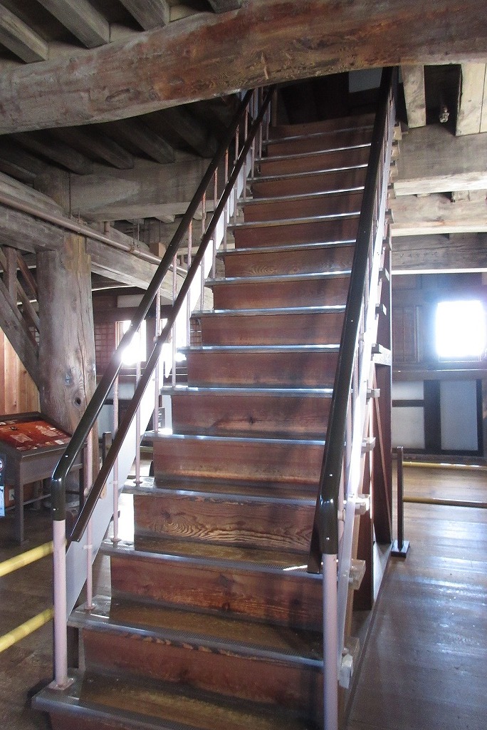 軍事要塞である天守に2本も階段があるのはおかしいと思ってお城の係員に尋ねたところ、昭和の大修理で設置したものとのことでした。それも滑り止めや手すりのある現代風のもので、よく見ると明らかに異質なんです。昭和の大修理の際に文化庁がどう判断したのかわかりませんが、今からすれば実に先進的であったと思います。