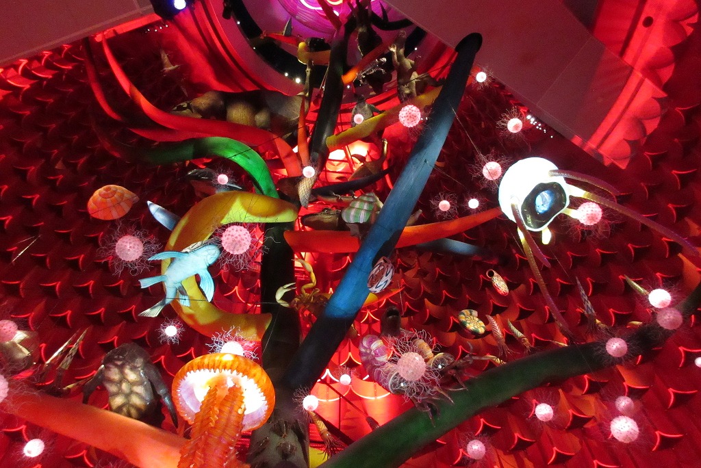 太陽の塔の内部はこのような展示がされています。事前に見て知ってはいましたが、いざ実際に内部に入ってみると、その異様さと異種さに違和感を覚えました。