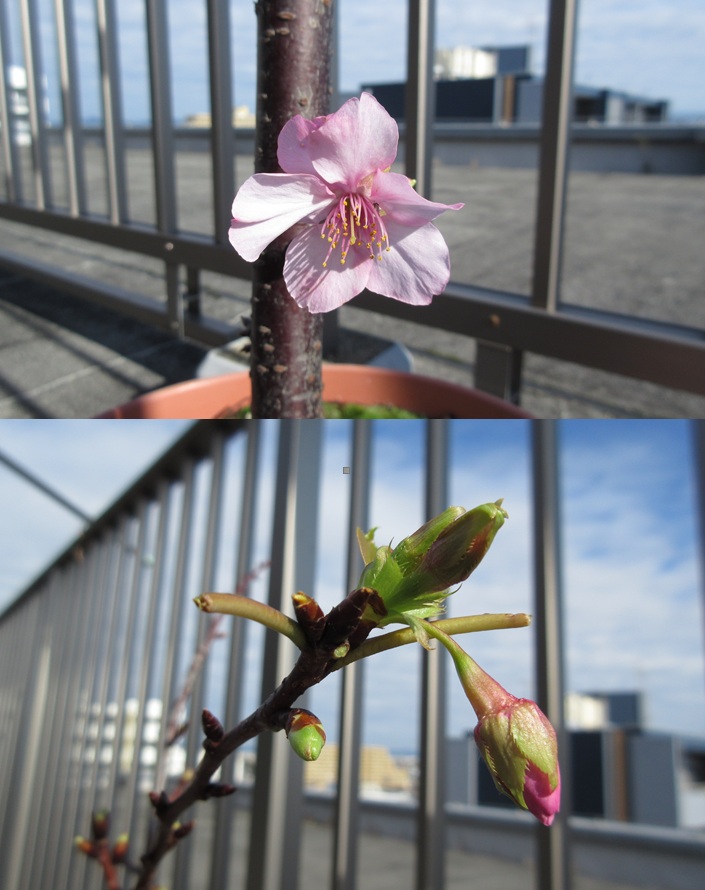 ここ数日、非常に寒い日が続きました。名古屋では昨日朝の最低気温がこの冬初めて氷点下になりました。そのため一時的ではありましたが、ビニルハウス内の温度計を見たら最低気温のログが7.0度を記録していて、植物たちもちょっと寒かったことでしょう。この寒さの中、わが家の河津桜が開花し始めました。今までが暖かかったからなのかもしれませんが、まさか年末に桜の花を見ることができるとは思ってもいませんでした。1輪だけではなくいくつかのつぼみが膨らんできているのですが、これから極寒の1月になってどうなるのでしょうね。