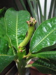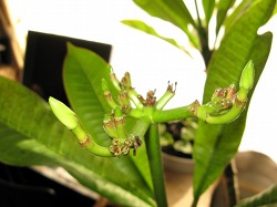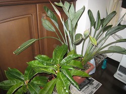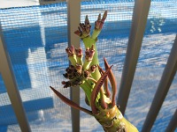 越冬中の「プルメリア」。春になって朝晩の室温が下がらなくなってきたので、つぼみになるペースが早くなりました。 |