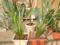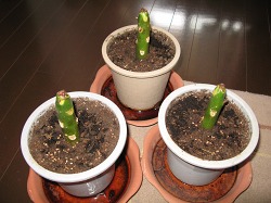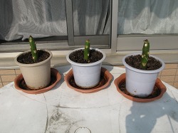 昨年挿し木したプルメリア。根が出ているのかどうかも、まだわかりません。枯れてはいないようです。 |