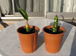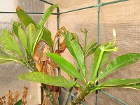 ほかのプルメリアですが、1鉢は2枚の葉のうち1枚が落ちてしまいました。 |