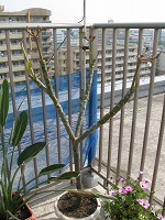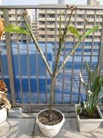 ほぼ丸坊主のプルメリアです。ここから伸び始めると、ちょっと不恰好ですよね。 |
