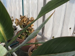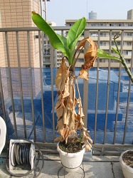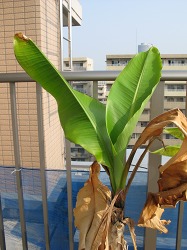 ミニバナナは越冬したものの、相変わらずボロボロ状態です。 |