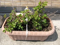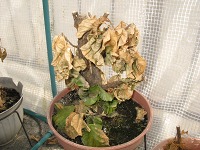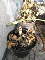 屋外で越冬させたもう1鉢のほうは、ついに夏の間に花を咲かせることはありませんでした。それどころか、葉っぱが成長しないんです。 |