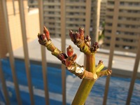 丸太のプルメリアからも、葉っぱが伸び始めました。 |