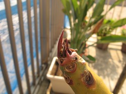 プルメリアは親木をあきらめ、急きょ枝を剪定して、室内に入れることにしました。今のところ枯れずにいてくれています。 |