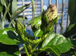 今までこんな経験したことがないのですが、こんな時期になって、ハイビスカスたちに大量のアブラムシが付いてしまいました。 |