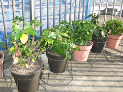 屋外に出したハイビスカス。とはいえこのままですと葉が落ちてしまうので、いったんビニルハウスに入れます。 |