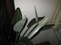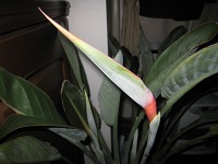 「ゴクラクチョウカ」です。ようやくくちばし状の花が伸びてきました。 |