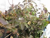ビニルハウス内で越冬させたハイビスカス。生存の確率は低そうです。 |