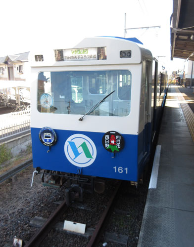 次の停車駅「日永」で下りの内部行きと行き違い。のりかえもできそうです。内部行きの列車は「なろうグリーン号」。 |