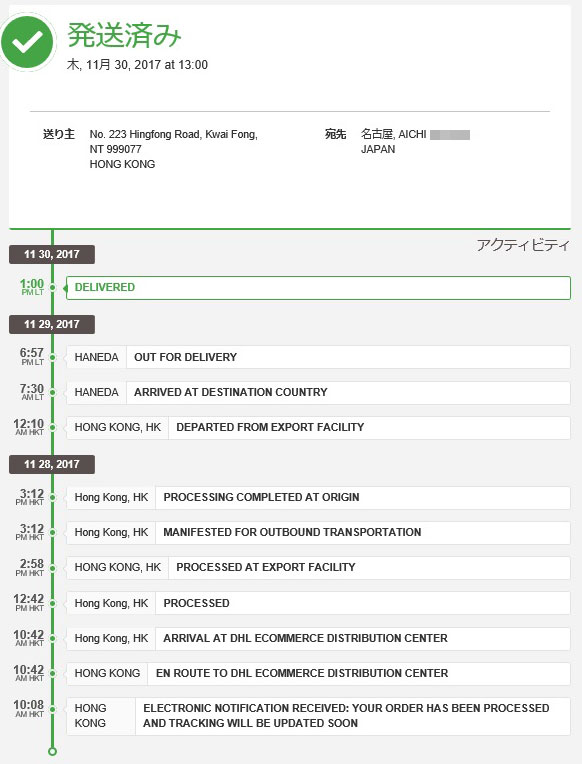今回、土曜日に注文したため、実際に香港ベースを出発したのは28日の火曜日。それからわずか3日で私のところにやって来ました。これは最短記録だと思います。 |