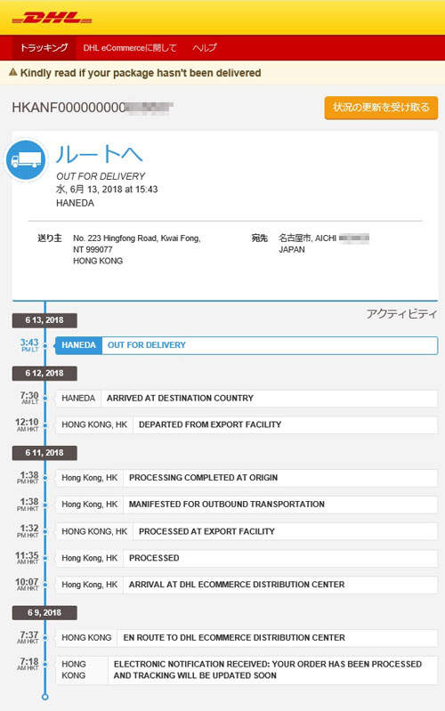 注文してから8日目に商品届きました。 香港ベースを出発したのが11日ですから、実質的な配送にかかったのは3日間。香港税関が土日お休みだったのでしょう。 |