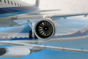 機体下側の写真。細部に渡って精密に再現されたデカールは全日空商事のモデルプレーンならでは。 |