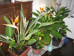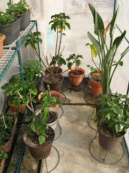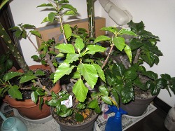 そして室内に入れた鉢木たち。プルメリア2鉢、ゴクラクチョウカ、それにハイビスカス7鉢を入れました。 |