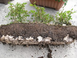 プランターから抜いてみると、土がかなり流れてしまっていて、すぐ下に鉢底石の代わりの発泡スチロールが来ていました。 |