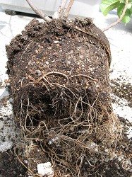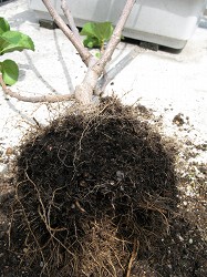 鉢から抜いてみると、根っこがとぐろを巻くように詰まっていました。 |