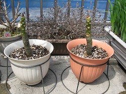 去年生えた葉がすべて落ちてしまった「プルメリア」。でも、枯れてしまったわけではないんですよ。 |