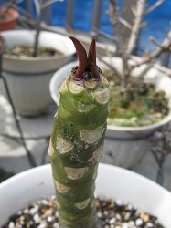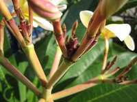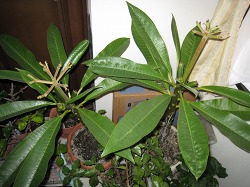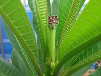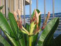 ![]() もう1鉢のプルメリアも、着々とつぼみを育てていますよ。こちらはどんな花を咲かせてくれるかな・・・。 |