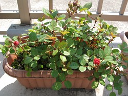 こちらは今年植替えをしなかったほうの「ミニバラ」。いくつかのつぼみがほころび始めました。 |