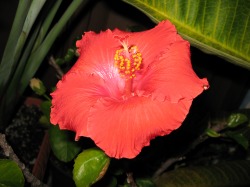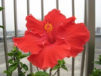 大輪の赤「バルカン」です。私は在来種の赤を育ててないので、保有する唯一の赤のハイビスカスです。 |