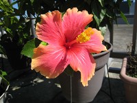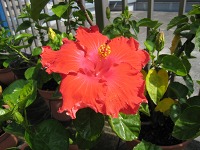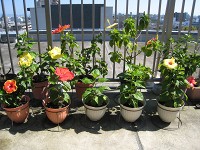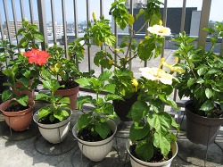 ビニルハウスもすでに片付けて、ハイビスカスたちも太陽をいっぱい受けています。 |