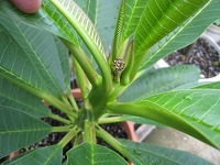 プルメリアの先端。葉っぱに守られるように、つぼみが出てきました。 |