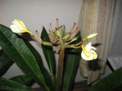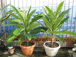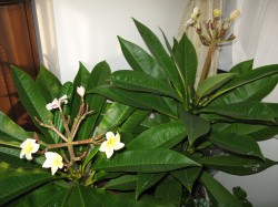 室内に入れたプルメリアです。やはり太陽に当たっていないせいか、葉っぱの色が悪くなってきました。 |