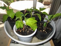 まずは屋内で越冬させた、葉っぱが茂っている4鉢のハイビスカスを植え替えることにしました。 |