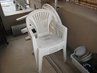 軽いプラスチック製の机やイスも全部ベランダに移動。これらが風で飛んでしまうと大変ですから。 |