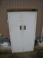 物置は扉が開かないように、ビニルひもで縛っておきました。 |