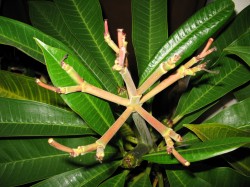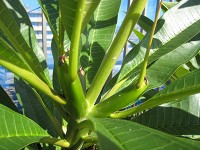 プルメリアです。冬越しで丸坊主になっていましたが、こうして葉っぱが茂ってきましたよ。 |