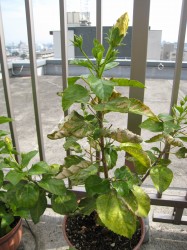 アブラムシだらけになっていた「ハイビスカス」ですが・・・。すでにアブラムシの姿はありません。 |