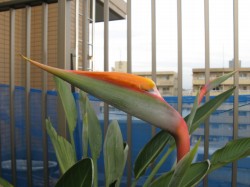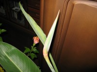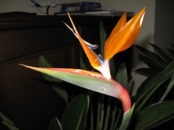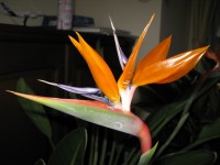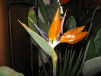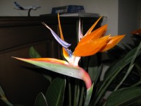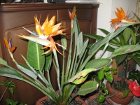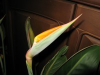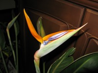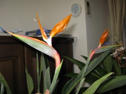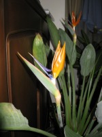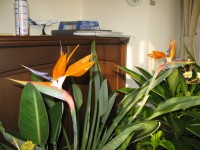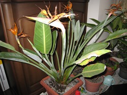 現在3羽のゴクラクチョウカが咲いています。開花が近いつぼみが1つ、まだふくらんでおらず、つぼみかどうかが不明なのが2つ。この冬はゴージャスなゴクラクチョウカで室内が鮮やかです。 |