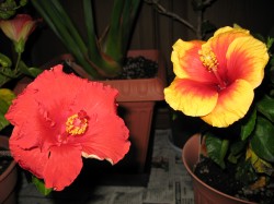 ハイビスカスたちも、夏の間にできたつぼみが、室内の温度で開花しています。 |