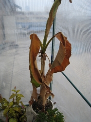 ちょっと見るも無残な「ミニバナナ」。昨年は越冬に成功しましたが、今年はどうでしょうか? |