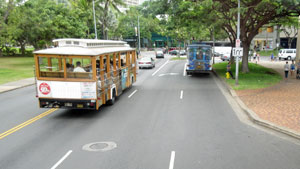 レインボートロリーの車内です。ワイキキを回って再びTギャラリアへ向かいます。 |
