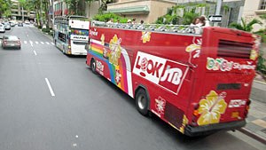 多くの人が乗降し、Tギャラリアを出発。さきほど乗車したJALパックのレインボートロリー同様、カラカウア大通りを走って、東へ向かいます。 |
