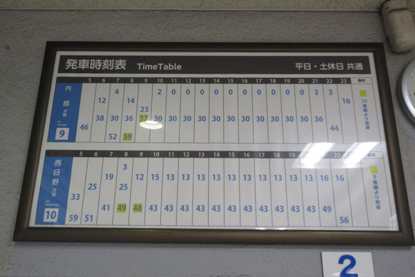 時刻表です。朝の通勤通学時間帯を除くと内部行きと西日野行きがそれぞれ30分間隔で運行。 |