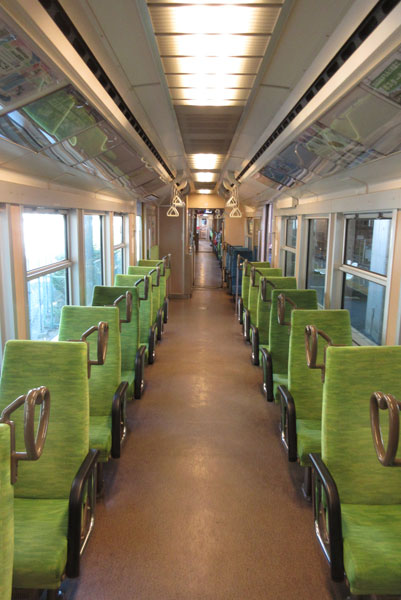 車内はこんなカンジ。ナローゲージの車幅2.1mの小さな車両です。 |