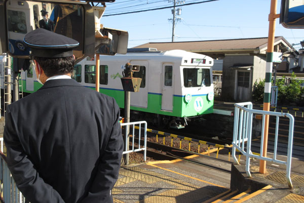 次の停車駅「日永」で下りの内部行きと行き違い。のりかえもできそうです。内部行きの列車は「なろうグリーン号」。 |